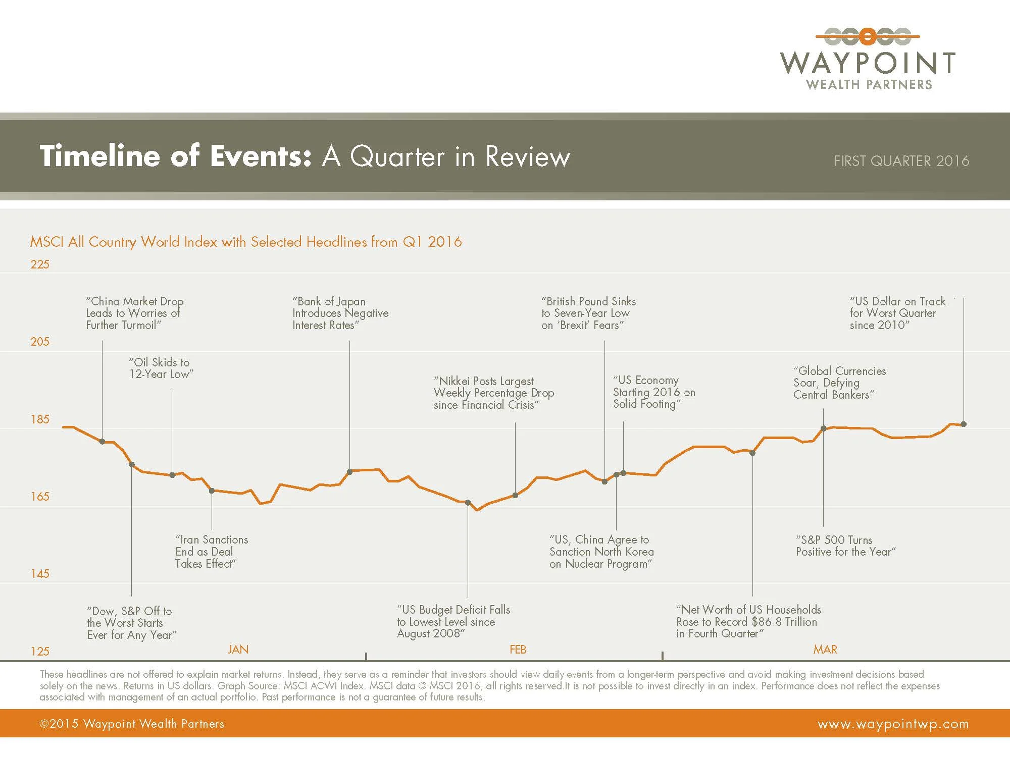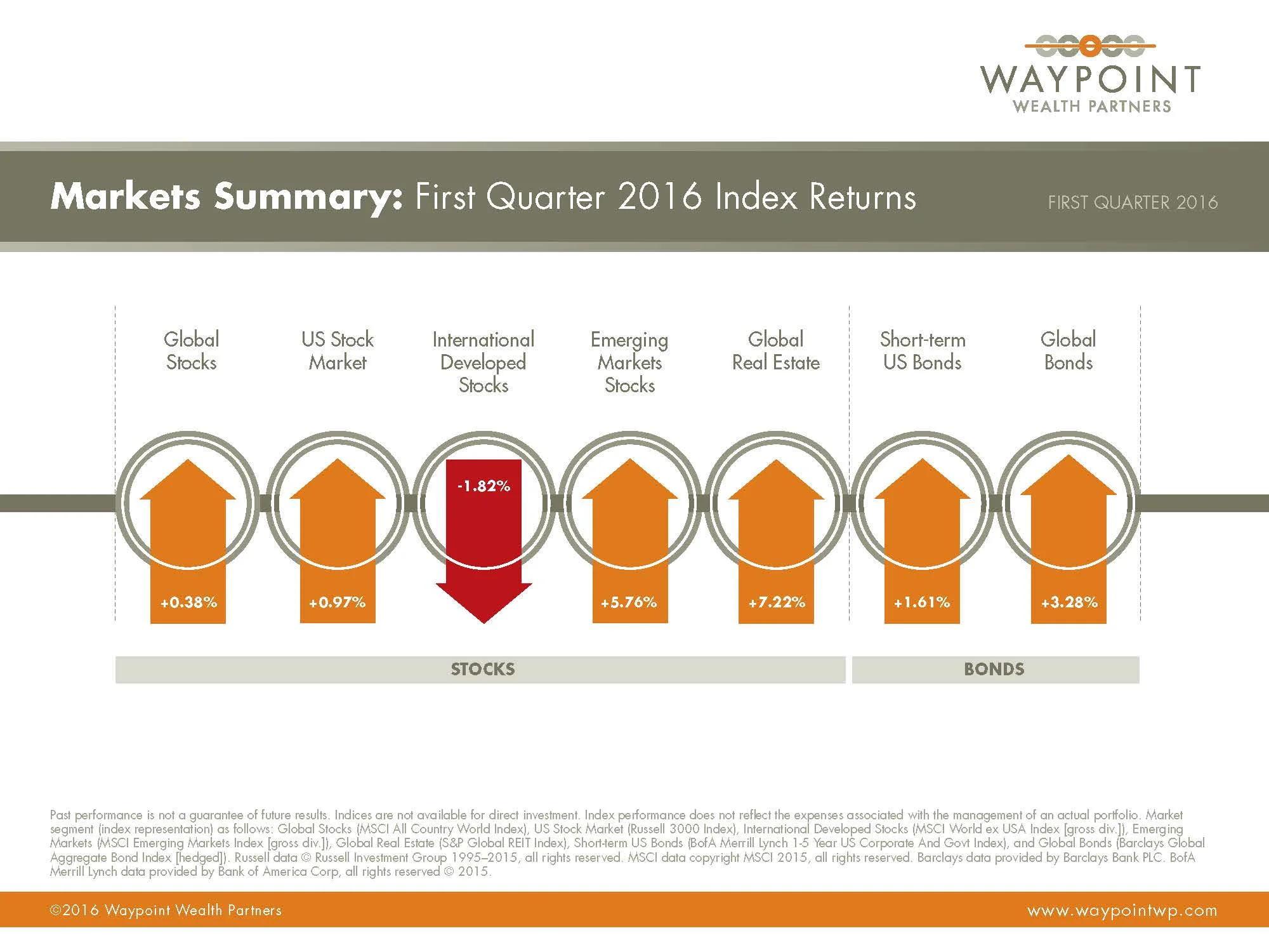 If you are just now looking at market returns for the first quarter you would be forgiven for thinking that the markets experienced a relatively boring three months. Developed markets finished flat, emerging markets were finally positive, real estate bounced back from a weak 2015 and bond returns were in the low single digits. However, a lot can happen in three months and what actually transpired was far from dull. January delivered one of the worst starts to a year the S&P 500 index has ever experienced, global recession concerns spiked, oil prices fluctuated wildly and the Chinese economy continued to produce mixed signals. Selling pressure continued through the first week of February before cooler heads prevailed and the second half of the quarter topped off a whirlwind of action with a significant recovery.