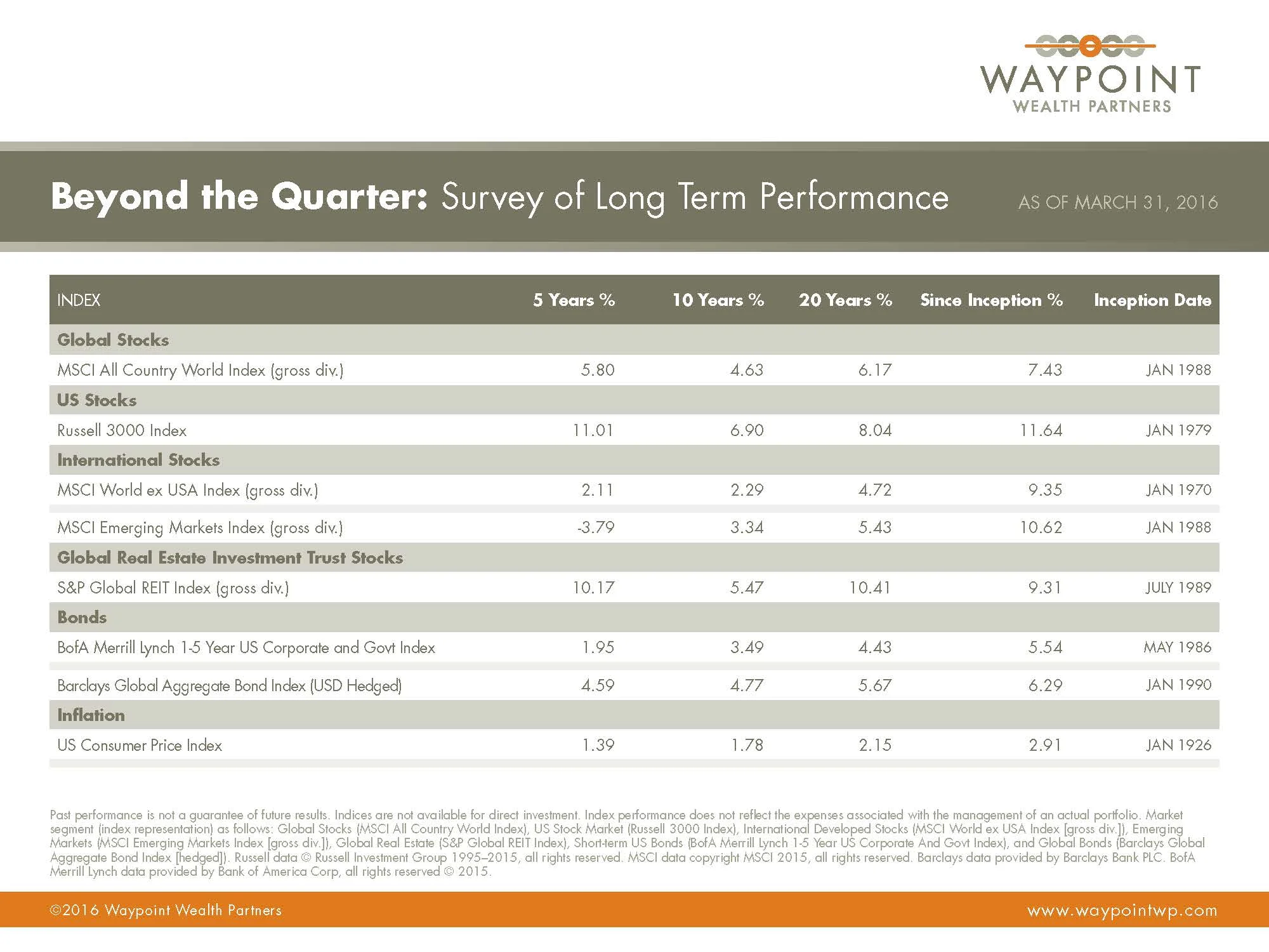 The quarter began with many questioning whether or not we were approaching a global down-turn. There was indeed weak economic data, uncertainty about the impact of plunging oil prices and a fear that the US Federal Reserve increased interest rates too soon. Additionally, the pace and severity of China’s slowdown was also a concern and the US consumer retrenched a bit in January. However, there was plenty of data to support a belief in continued economic growth as well. In mid-February, central bankers released statements citing their commitment to supportive policies and underscored the continued economic improvement. The US job market produced solid results and wage increases gained much needed momentum, which has been an absent trend. Key measurements of the service economy also produced favorable results. Due to the additional uncertainty generated in the quarter, the Fed is now forecasting they will increase interest rates at a slower pace than initially planned while the European Central Bank announced it will be even more aggressive implementing its monetary policy. Overall, inflation is low and economic growth around the world remains positive but there is plenty of room for improvement.