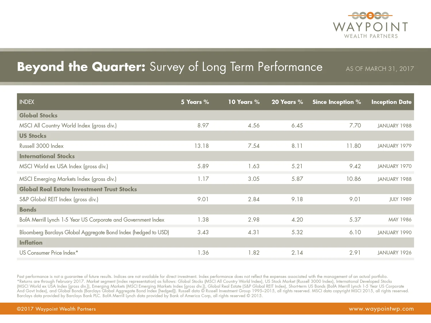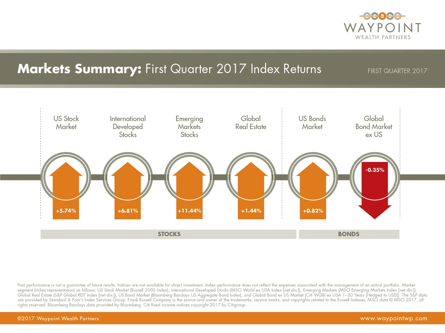 Political headlines continued to dominate the capital markets during the first quarter. The incoming administration promised new policies such as tax reform, infrastructure spending, and deregulation that could stimulate economic growth. Stock and bond markets had very different reactions to the news. Stocks responded with optimism and priced in the benefits of the new policies, resulting in another strong quarter. The bond market took a wait and see approach to the new administration, wanting to see some progress before responding. The interest rate environment remained stable during the quarter and performance was relatively flat for fixed income. Capital markets will continue to closely monitor activity in Washington D.C. When the American Health Care Act failed to pass in March, investors started to question the administration’s ability to deliver on the other initiatives. Will stock or bond investors be proven right in the end? Only time will tell and our globally diversified portfolios of both stocks and bonds are built for such uncertain times. Investors will be anxiously waiting to see if President Trump can deliver on his promise to boost the economy.