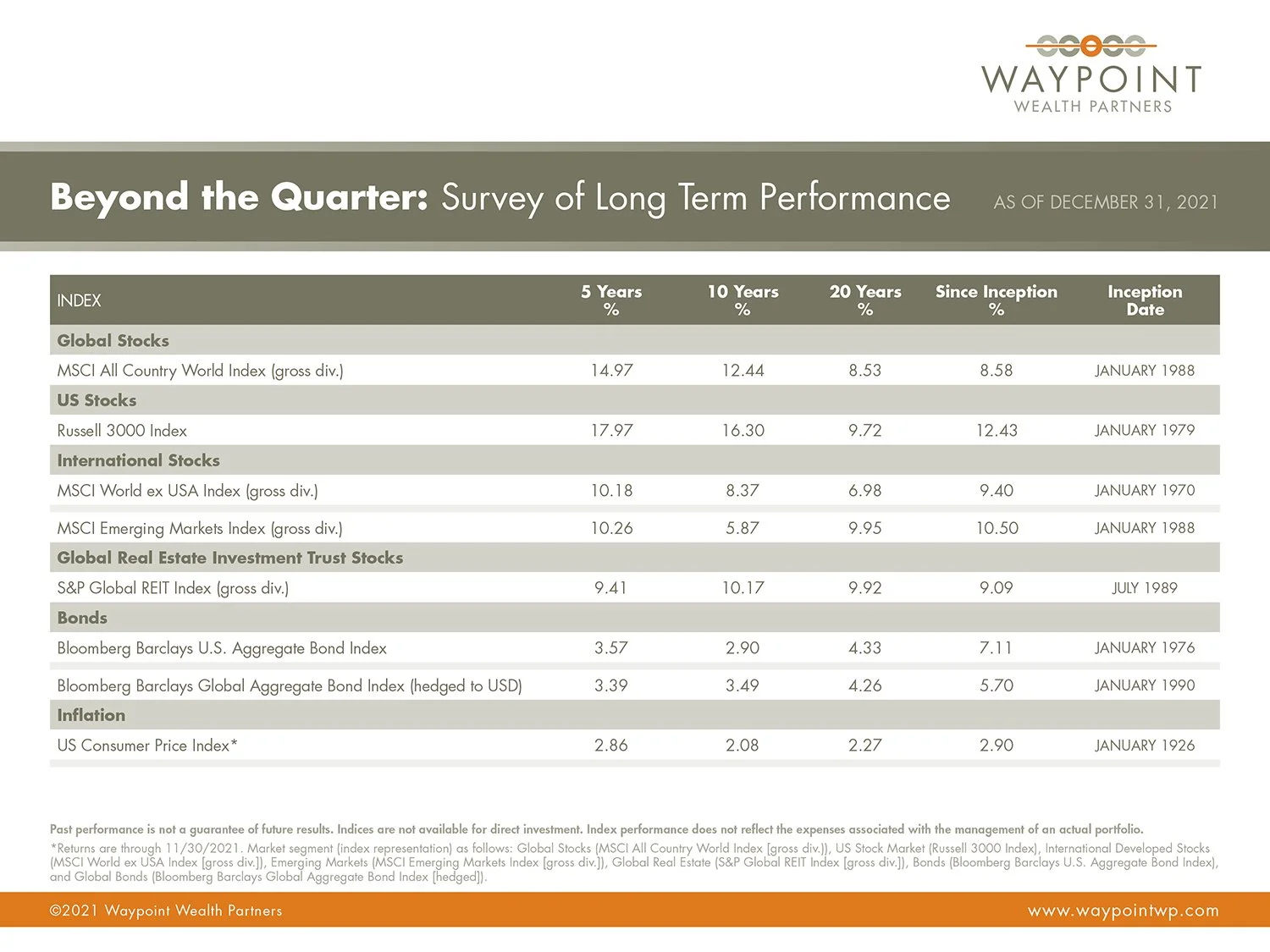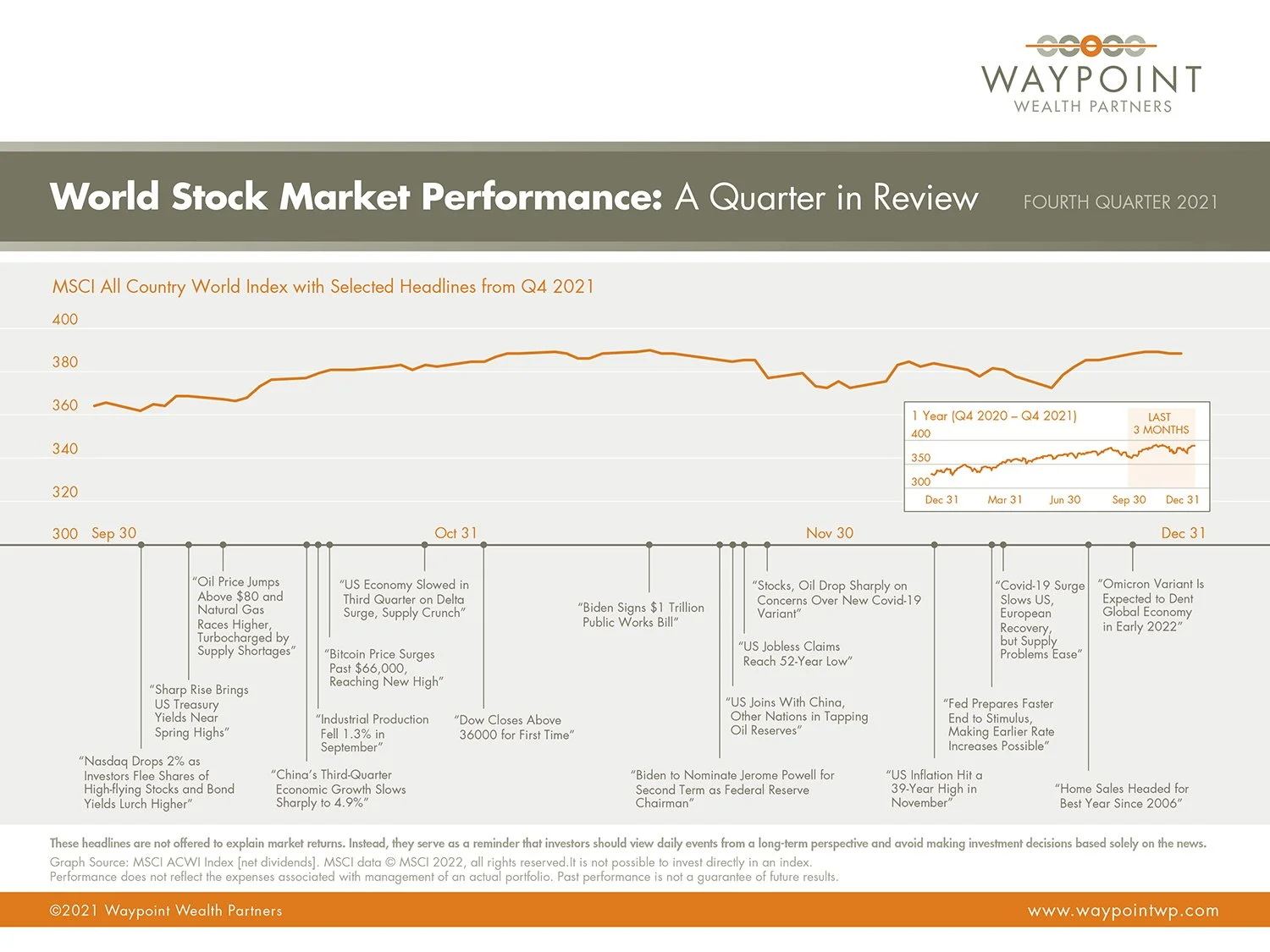 In our last quarterly review, we wrote of concern about the Delta variant. This quarter, a much more contagious though seemingly less severe Omicron variant clouds the economic outlook. While the impact won’t be quantified until we get more data over the next several months, we saw it contributing to canceled flights over the holidays, delays in receiving goods, and general worker shortages across the public and private sectors of the economy. Despite this, a robust and supportive global economic growth environment is expected to continue throughout 2022, absent any exogenous shocks.