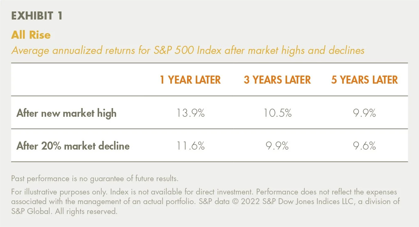Investors are often conflicted about record-high stock prices. They are pleased to see their existing equity holdings gain in value but apprehensive that higher prices somehow foreshadow a dramatic downturn in the future. And they may be reluctant to make new purchases since the traditional “buy low, sell high” mantra suggests committing funds to stocks at an all-time high is a surefire recipe for disappointment.